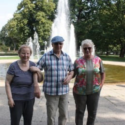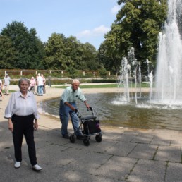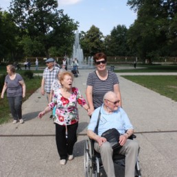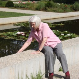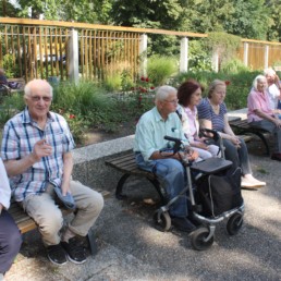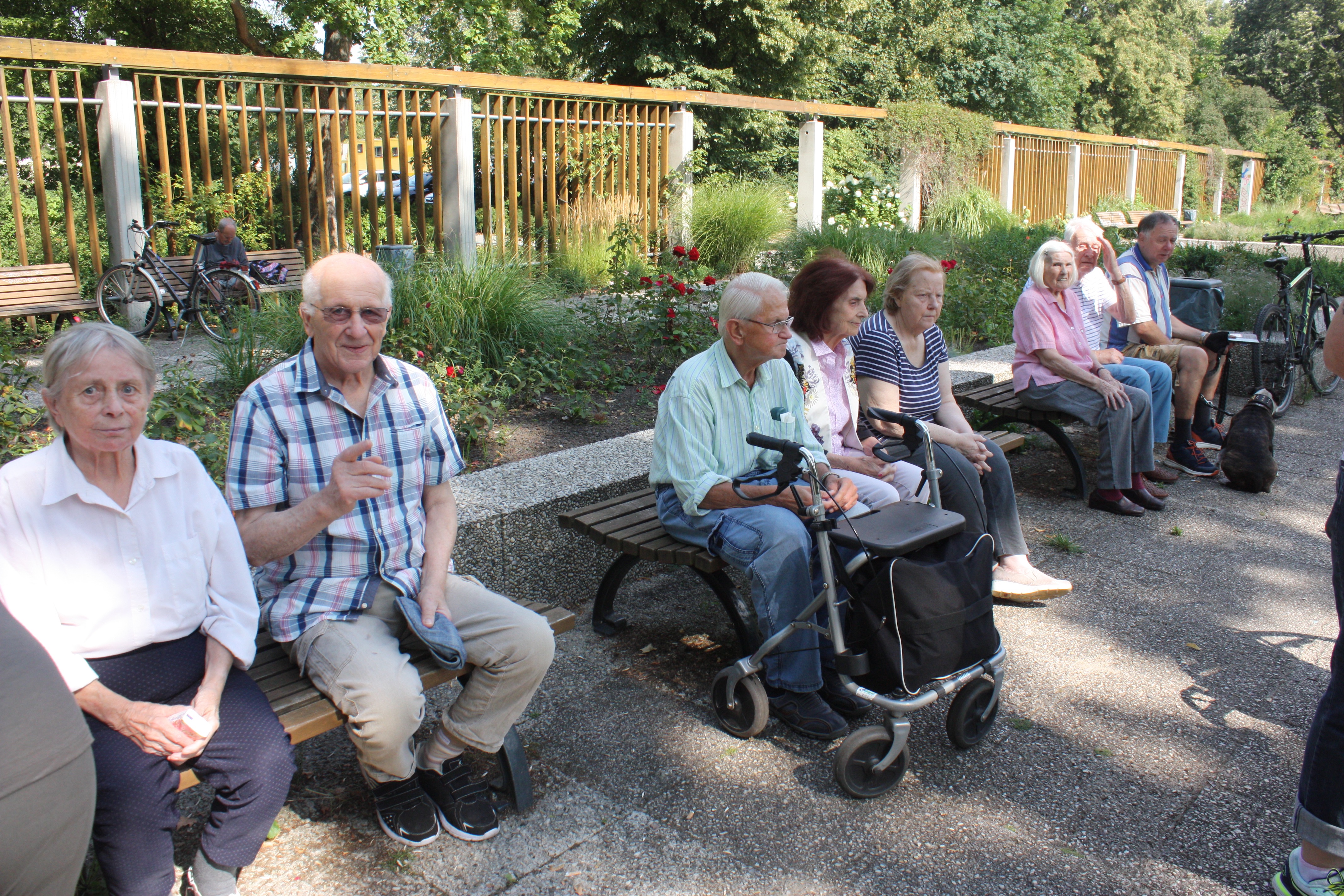 Wir erfreuen uns im Rosengarten am Duft der Blumen, am schönen Wetter, unserem Picknick, tanzen zu Musik und sind alle fröhlich.